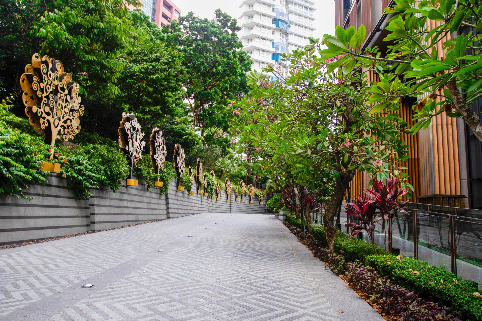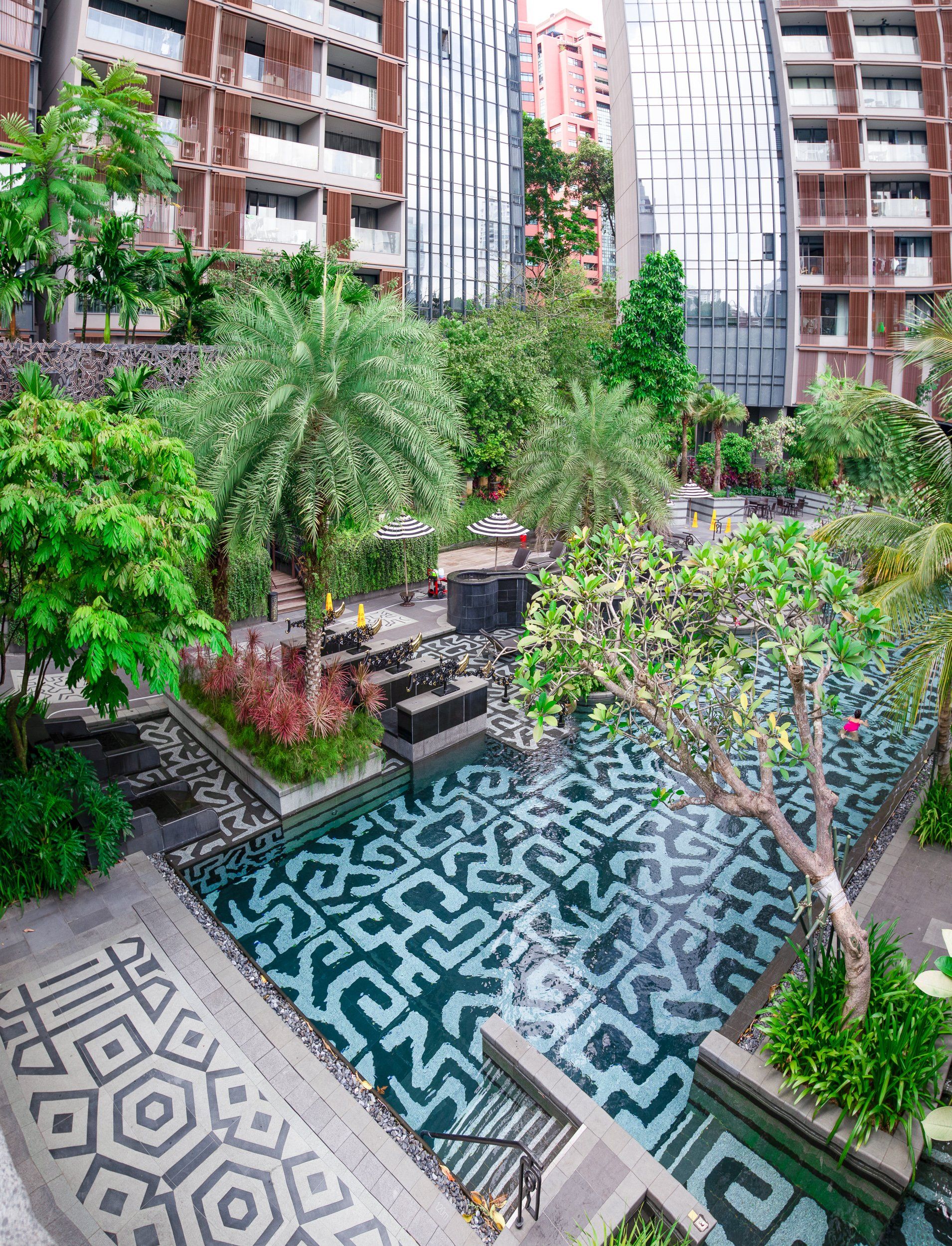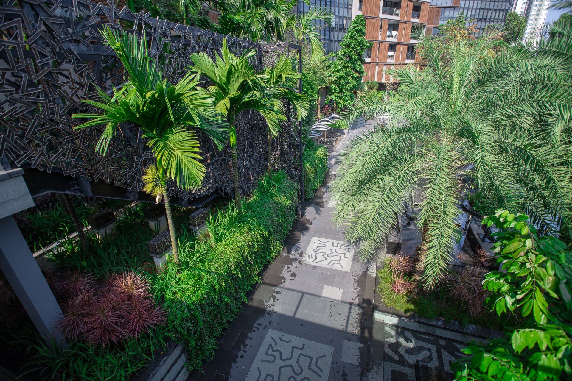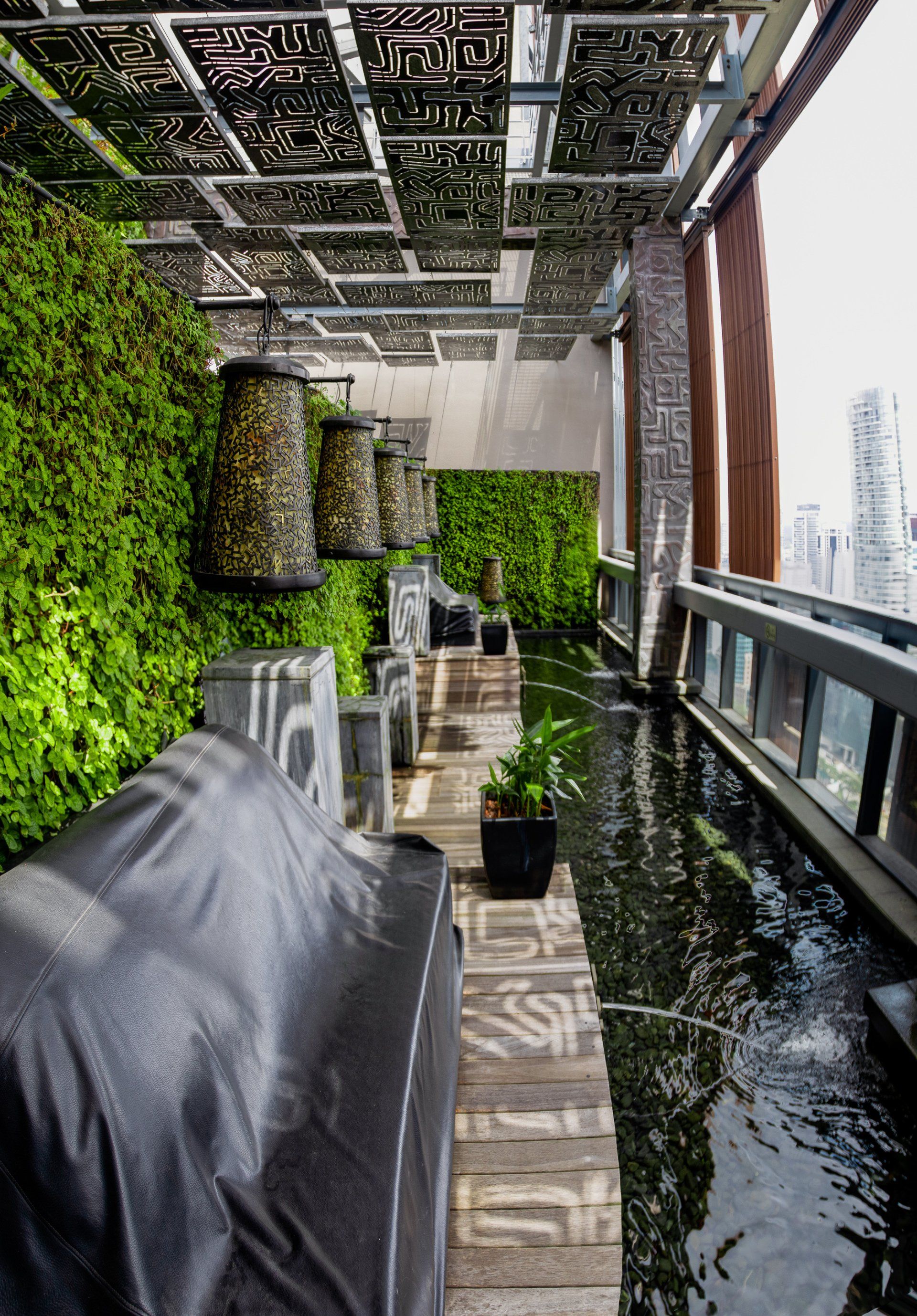 The development has been designed with a unique resort-within-the-city concept, distinguished by lush landscape features usually only seen in world-renowned resorts such as those found in Phuket, Bali and the Maldives. Above at its viewing terraces are tall Pilea walls that require a lot of effort keeping it in pristine condition, as soil media is replaced from time to time. Certain species of plants are not native and have hard time coping with the hot weather in Singapore, therefore special effort is required to monitor frequently and apply a fertilizing regime as required.