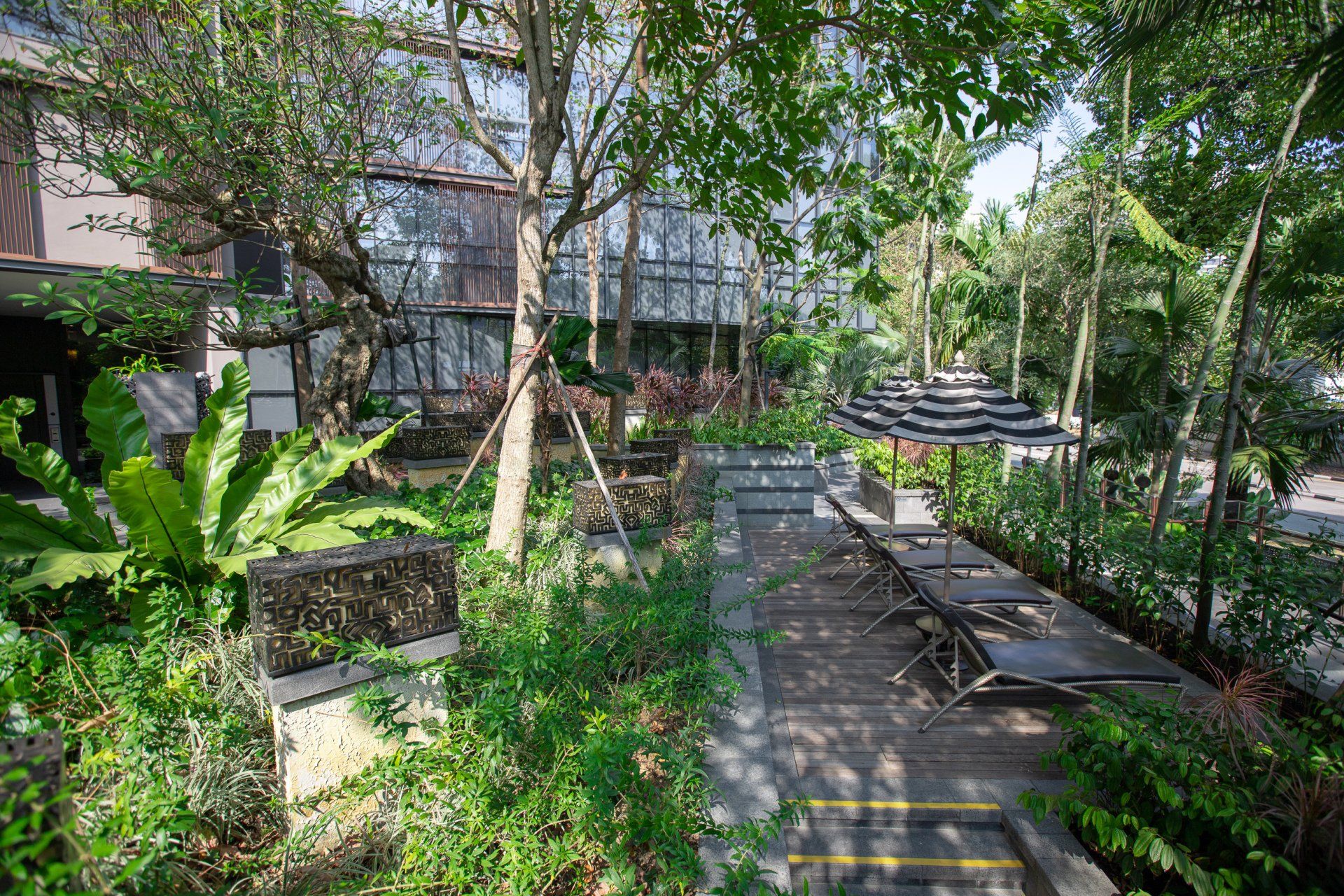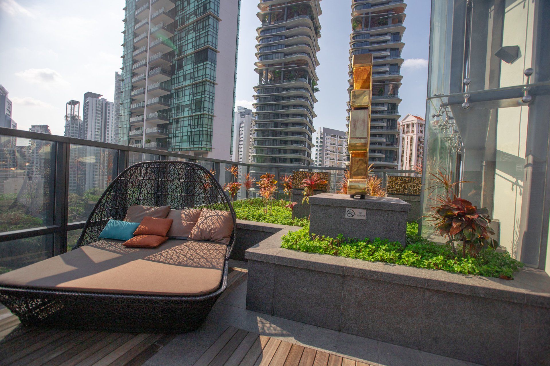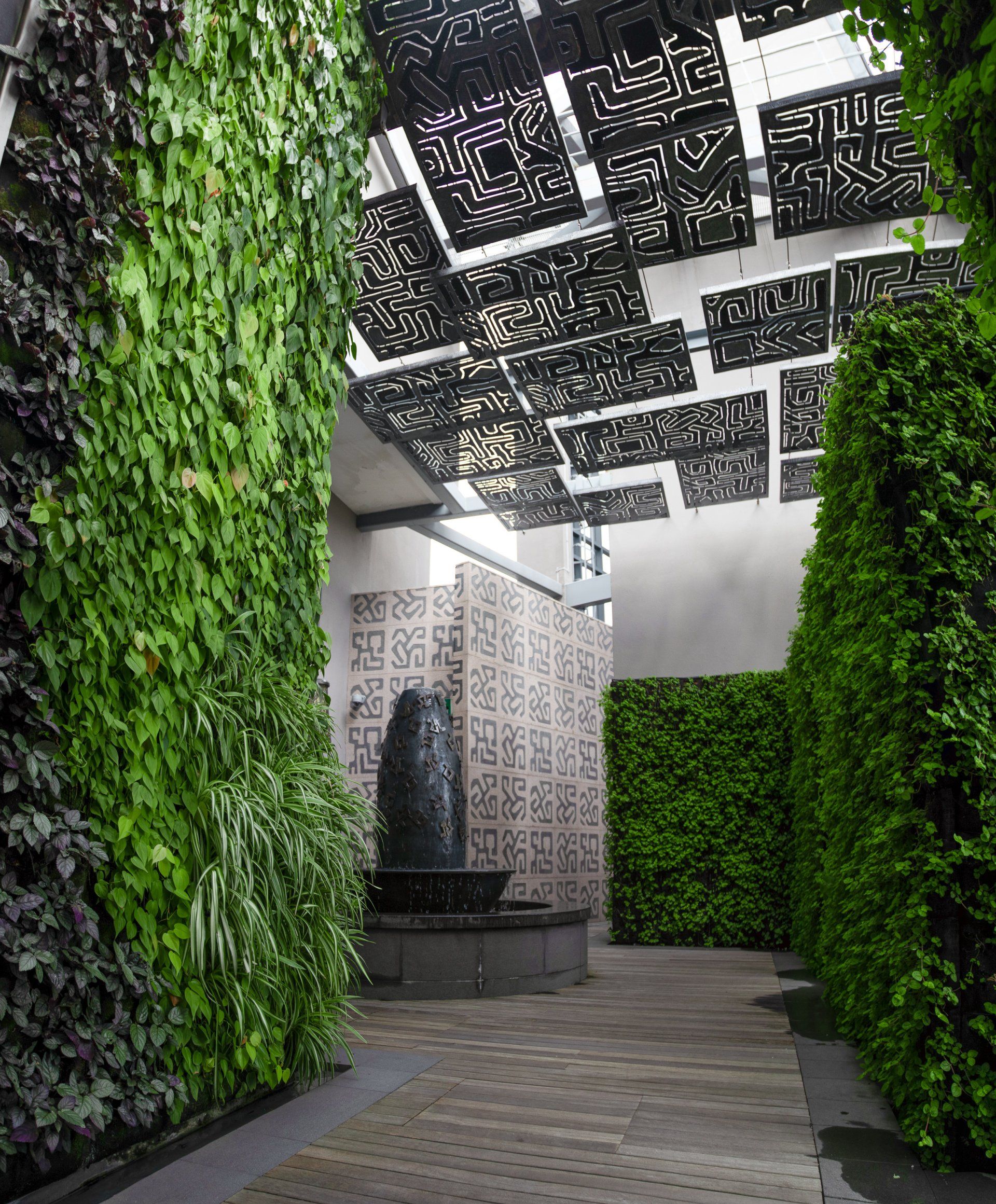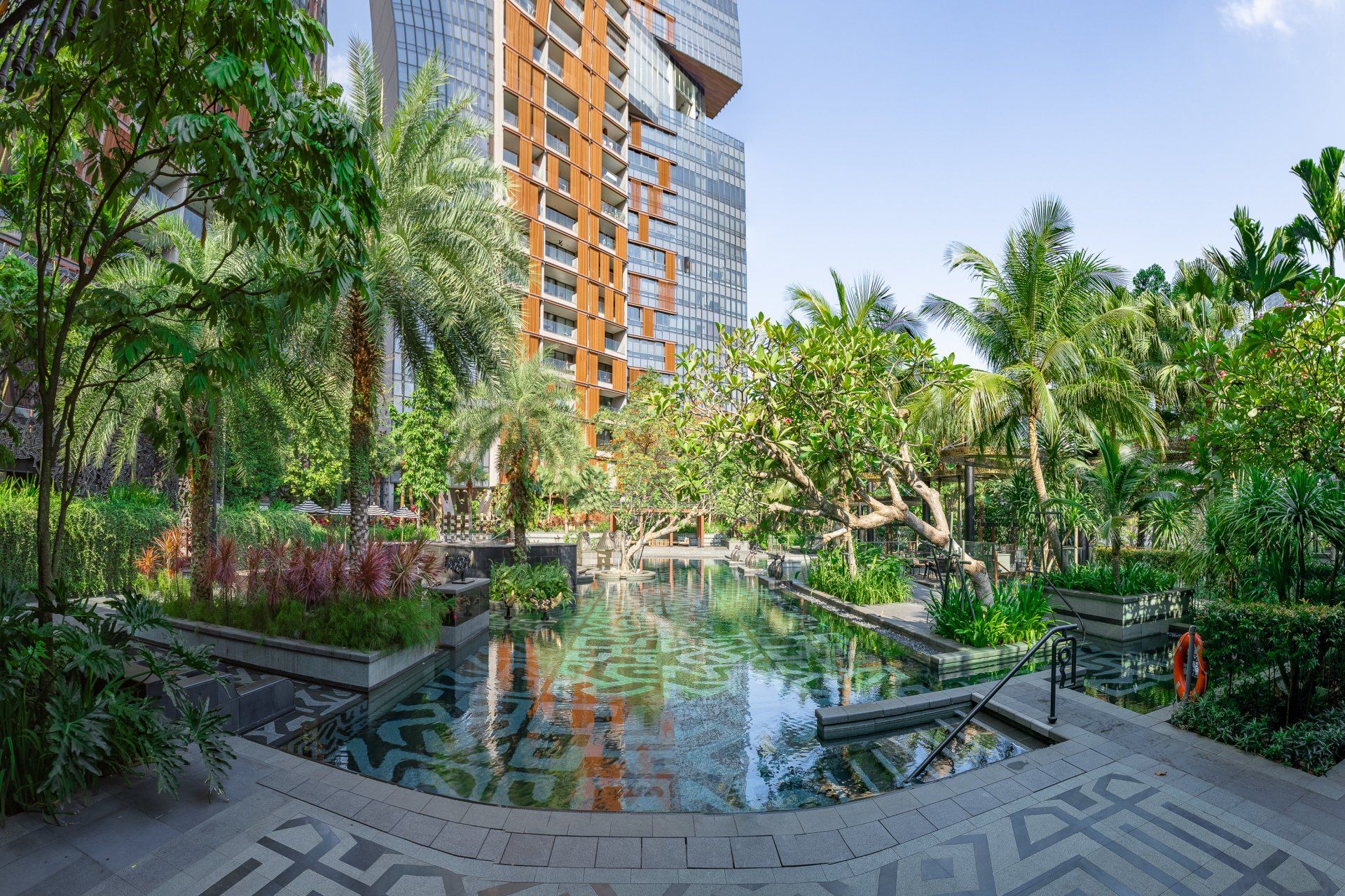 The development has been designed with a unique resort-within-the-city concept, distinguished by lush landscape features usually only seen in world-renowned resorts such as those found in Phuket, Bali and the Maldives. Above at its viewing terraces are tall Pilea walls that require a lot of effort keeping it in pristine condition, as soil media is replaced from time to time. Certain species of plants are not native and have hard time coping with the hot weather in Singapore, therefore special effort is required to monitor frequently and apply a fertilizing regime as required.